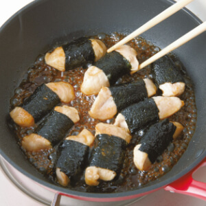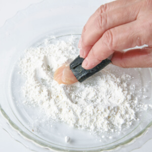 鶏肉は皮を除き、縦半分に切ってから斜めに1cm厚さに切る。塩少々をふってまぶす。のりはキッチンばさみで半分に切り、鶏肉の数に合わせて帯状に切る。鶏肉1切れの中央にのりを1枚ずつ巻きつける。【A】は混ぜておく。焼く直前に肉の部分に小麦粉適量をつける。