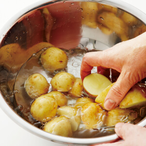 じゃがいもは水でよく洗い(全体備考参照)、ざるに上げて水けをきる。皮付きのまま半分に切り、水でサッと洗って切り口のでんぷんを除き、変色や煮くずれを防ぐ。ざるに上げ、水けを拭く。にんにくは縦半分に切る。