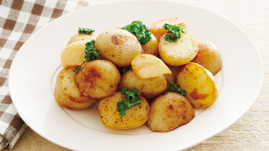 大きめに切って、外はこんがり、中はしっとり。にんにくとオリーブ油で風味よく焼き上げます。