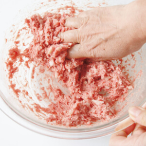 【肉ダネ】をつくる。たまねぎはひき肉によくなじむよう、細かいみじん切りにする。ボウルに2種類のひき肉を入れて塩、こしょうをふり、手で握るように混ぜる。まとまってきたら、たまねぎ、溶き卵、パン粉、牛乳を順に加えて混ぜる。最初は手で握るようにし、混ざったら円を描くようにし、粘りが出るまで練り混ぜる。