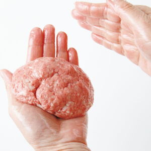 1を2等分にし、手に油少々をつけて【肉ダネ】を1コ分ずつ丸める。両手でキャッチボールをするようにして手にたたきつけ、中の空気を抜く。こうすると焼いたときにひび割れしにくい。1.5cm厚さの小判形に整える。