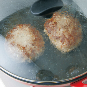 水大さじ1を加え、ふたをして弱めの中火にし、約4分間蒸し焼きにする。中央の厚いところに竹串を刺して澄んだ汁が出たら焼き上がり。濁った汁が出たら、ふたをしてさらに1~2分間焼く。火を止めて取り出し(フライパンは洗わない)、器に盛る。