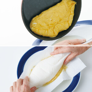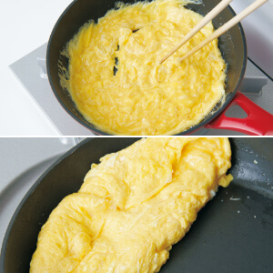 1人分ずつつくる。ボウルに卵3コを溶きほぐす。菜箸を一直線に動かして泡立てないようにほぐす。溶きすぎるとコシがなくなってふっくら焼き上がらないので、卵白の小さい塊が残るくらいでよい。塩・こしょう各少々、牛乳大さじ1を加え、同様に混ぜる。