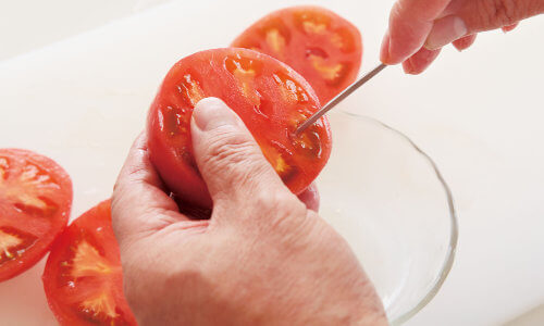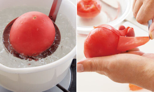 トマトは包丁でヘタをくりぬき、玉じゃくしにのせて沸騰した湯に10~20秒間つけ(写真左)、水にとる。包丁の先で引っ張るようにしながら皮をむく(湯むき/写真右)。