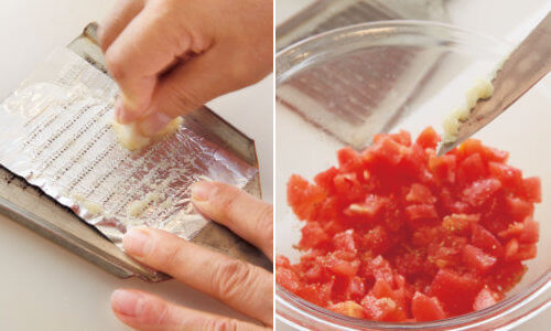 3. おろし金にアルミ箔(はく)をかぶせ、にんにくをすりおろす(写真左/こうするとにんにくがきれいに取れる)。アルミ箔を外しておろしたにんにくを包丁の背でこそげ、2に加える(写真右)。【A】も加えて混ぜ合わせる。