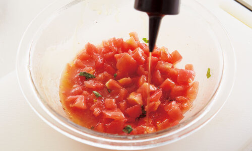 4. オリーブ油を3~4回に分けて加え、そのつどよく混ぜ合わせる(【フレッシュトマトソース】の完成)。