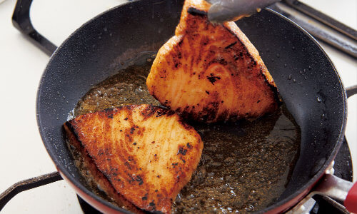 あっさりしたかじきに、甘酸っぱいトマトソースが相性バツグン!焼く前にソースにつけて、味をしみ込ませます。