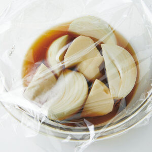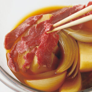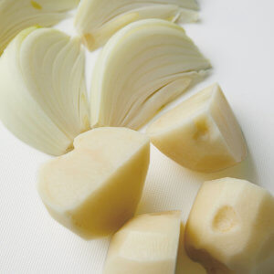 じゃがいもは4等分に切り、サッと洗って水けをきる。たまねぎは4等分のくし形に切る。牛肉は大きければ食べやすく切る。