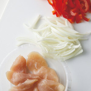 たまねぎは縦に5mm幅に切る。パプリカはヘタと種を除き、横に5mm幅に切る。ささ身は1本を4等分のそぎ切りにし、塩・こしょう各少々をふる。