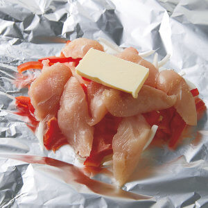 アルミ箔(30cm長さ)の中央にたまねぎ、パプリカ、ささ身の順に重ね、バターをのせる。
