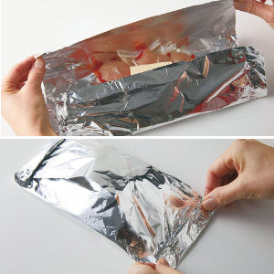 包むときは野菜を下に敷くと焦げつきにくくなり、肉のうまみで野菜もおいしくなります。アルミ箔をクチャクチャにして包んでしまうと、隙間ができやすく、見た目もいまいち。上下を重ね、左右を折ってしっかり閉じると、きれいに包めます。アルミ箔の隙間から汁が出る場合があるので、必ず天板にのせましょう。オーブントースターの設定は、トーストを焼く温度(W数)を目安にします。