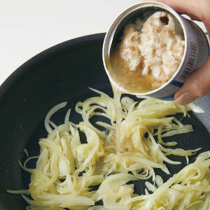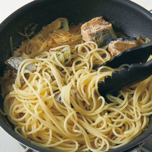 今回ご紹介するのは「さば缶と青じその和風スパゲッティ」。うまみたっぷりのさば缶は、汁ごと使ってパスタのソースに。たまねぎの甘みが、全体をマイルドにまとめてくれます。仕上げに加える青じその爽やかな香りがアクセントに。
