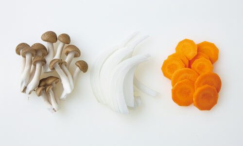 しめじは根元を切り落とし、小房に分ける。たまねぎは縦に薄切りにし、にんじんは薄い輪切りにする。野菜を薄く切るとさけと同時に火が通る。【A】 は混ぜ合わせ、バターは小さく切っておく。
