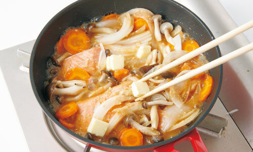 さけを野菜と一緒に鉄板などで焼き、みそ仕立てにするちゃんちゃん焼きは、北海道の郷土料理。フライパンでも手軽につくれます。