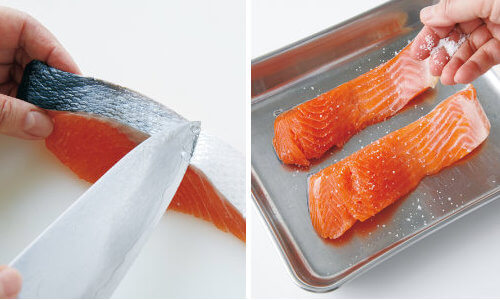 さけは包丁の先で皮を軽くこすって残っているウロコを除き、ペーパータオルで水けを拭く。バットに皮を下にして入れ、塩少々をふる。