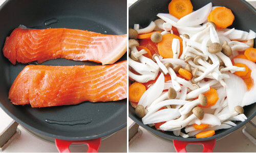 小さめのフライパンにサラダ油小さじ2を中火で熱し、さけを皮を下にして並べ入れる。たまねぎ、にんじん、しめじを加える。
