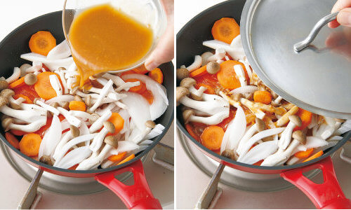混ぜておいた【A】を回しかけ、ふたをして、約6分間蒸し焼きにする。途中、焦げないよう軽く混ぜる。