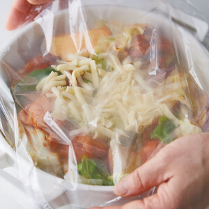 レンジから取り出して全体を混ぜる。チーズを散らし、余熱でチーズが溶けるまでラップをかけてそのままおく。