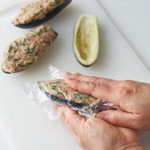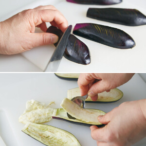 なすは縦半分に切り、皮に細かく斜めに切り目を入れる(写真上)。塩水(水カップ2+1/2に塩大さじ1)に5分間ほどつけてアク抜きをし、ペーパータオルで包んで水けを絞る。皮を3mmほど残して中身をスプーンでくりぬく(写真下)。