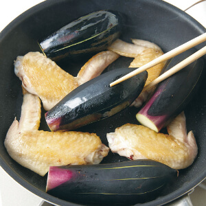 フライパンに油を入れ、手羽先を皮の厚いほうを下にして並べ入れ、中火にかける。3~4分間焼いて焼き色がついたら返し、手羽先の間になすを加える。弱めの中火にし、時々返しながら5~6分間焼く。