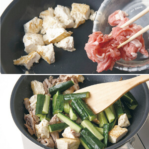 フライパンに油をひかずに豆腐を一口大にちぎって入れ、中火にかける。薄い焼き色がつくまで炒め、水けがあればペーパータオルで拭く。端に寄せ、あいたところに油を熱して豚肉を加え、約2分間炒める。きゅうり、【A】を加えて強めの中火にし、全体を混ぜながら3~4分間炒める。
