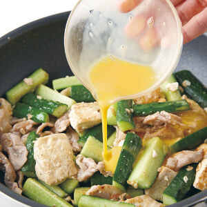 ゴーヤーでおなじみのチャンプルーをきゅうりでつくります。淡泊な味わいのきゅうりに、豆腐と豚肉、卵でうまみアップ。さっぱりしているのに食べごたえ十分の満足おかずです。