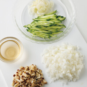 たまねぎはみじん切りにする。【トッピング】のきゅうりは斜め薄切りにしてからせん切りにし、ねぎは小口切りにする。
