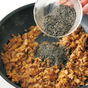 フライパンに油を中火で熱し、ひき肉を入れてほぐしながら炒める。色が変わったら、たまねぎ、しいたけを加えて5~6分間炒める。たまねぎがしんなりしたら、【A】を加えて混ぜ、すりごまを加えて全体を混ぜ、火を止める(肉みそ)。