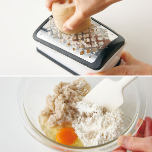 れんこんはよく洗って水けを拭き、皮付きのまますりおろす(写真上)。計量スプーンで軽く押して、おろし汁約大さじ3を除き、【A】を加えて混ぜる(タネ/写真下)。