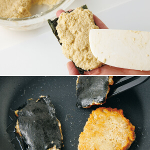 のりは6等分に切り、3枚にタネを1/6量ずつのせて平らにする(写真上)。1のフライパンにタネを下にして3枚並べ、中火で2~3分間焼き、返して約1分間焼く(写真下)。火を止めて取り出す。油大さじ1/2を足して中火で熱し、残りのタネも同様にのりにのせて焼き、取り出す。