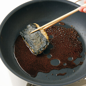 フライパンに【B】を入れて中火で煮立て、2をのりを上にして全部加え、フライパンを揺すってなじませる。器に盛ってししとうがらしを添え、好みで粉ざんしょうをふる。