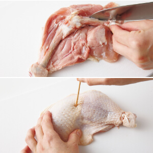 鶏肉は余分な脂肪を取り除き、足首の部分にグルリと切り目を入れる。皮を下にして置き、骨に沿って切り目を入れる。骨の反対側にも同様に入れ(写真上)、肉を開いて平らにする。皮を上にし、竹串を全体に刺して穴を開ける(写真下)。