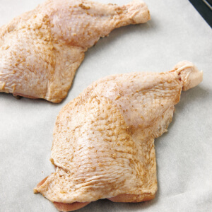 オーブンは200℃に温める。天板にオーブン用の紙を敷き、2の鶏肉を皮を上にして並べる。好みでこしょうをふり、200℃のオーブンで約30分間焼く。キャベツは太い軸があれば除き、手で食べやすい大きさにちぎる。器に鶏肉を盛り、キャベツを添える。