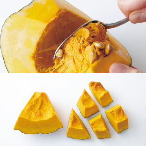 かぼちゃはスプーンでワタと種を取り除き(写真上)、よく洗って水けを拭く。皮付きのまま横半分に切ってから、1切れを5等分に切る(写真下)。