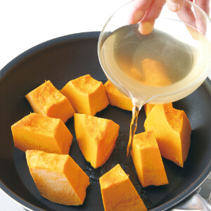 芋のような食感で人気のかぼちゃ。煮くずれしやすいので、皮をむかず、フライパンにひと並べにし、返さずに煮ます。
