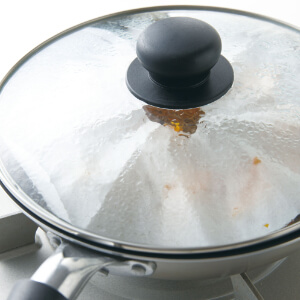 煮立ったら弱火にして落としぶたをし、さらにふたをして7〜8分間煮る。ふたを外し、煮汁をすくってかぼちゃにかけ、落としぶただけをしてさらに約3分間煮る。