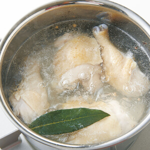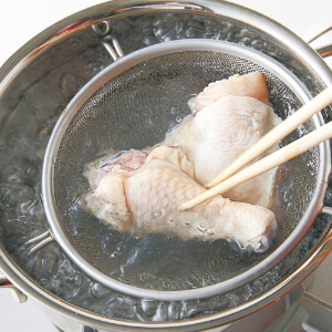 鶏肉の表面だけをサッとゆでると、骨から出た血が固まって取り除きやすくなり、煮たときにアクが出にくくなる。