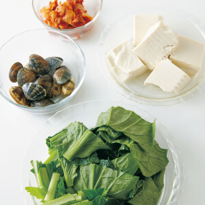 小松菜は4cm長さに切る。あさりは殻をこすり合わせて洗い、水けをきる。豆腐は5~6等分にちぎる。キムチは大きければ一口大に切る。