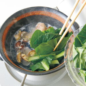 小さめの土鍋(または鍋)にあさり、水カップ1を入れて中火にかけ、煮立ったら弱火にしてアクを除き、小松菜を加える。時々混ぜながら、4~5分間煮る。