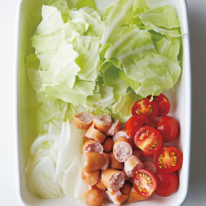 たまねぎは縦に薄切りにし、ミニトマトはヘタを除いて縦半分に切る。キャベツとソーセージは食べやすい大きさに手でちぎる。