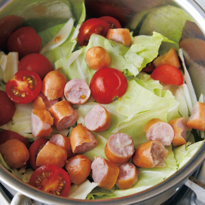 鍋にオリーブ油大さじ1/2を中火で熱し、たまねぎをしんなりするまで炒める。キャベツ、ミニトマト、ソーセージを加えて塩小さじ1/2をふり、水カップ1/2を注ぐ。ふたをして3~4分間蒸し煮にする。