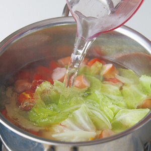 野菜から水分が出てきたら、水カップ2を加えて煮立たせ、弱火にして5分間ほど煮る。味をみて足りなければ、塩少々で調える。