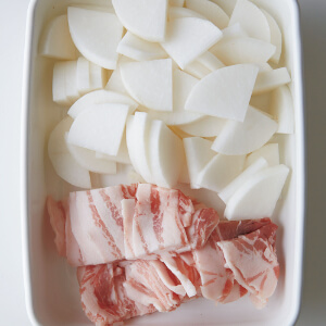 大根は5mm厚さのいちょう切りにする。豚肉は4~5cm幅に切る。
