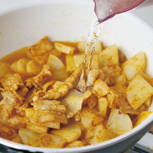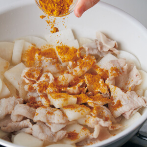 深めのフライパンに油大さじ1と大根を入れて中火にかけ、大根の端が透き通ってくるまでよく炒める。豚肉を加え、色が変わるまで炒めたら、塩小さじ2/3とカレー粉を加えて混ぜ、しっかりなじませる。