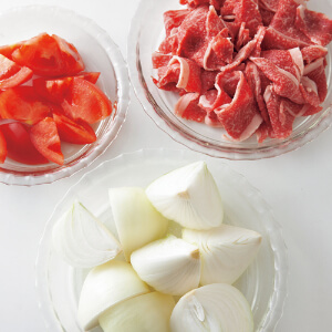 たまねぎは芯を少しつけたまま縦4等分に切る。トマトは縦半分に切ってヘタを除き、縦3~4等分に切ってから斜め半分に切る。牛肉は大きければ食べやすく切る。