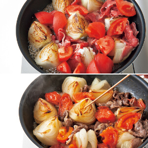 たまねぎの外側を下にし、隙間に牛肉とトマトを入れる。【A】を順に加え、煮立ってきたら(写真上)、弱めの中火にして落としぶたをし、さらにふたをして約15分間、たまねぎに竹串を刺してスーッと通るまで煮る(写真下)。汁けが残っていたら、ふたと落としぶたを外したまま約5分間煮詰める。
