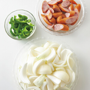 鍋に湯1.5リットルを沸かし、塩大さじ1/2を入れ、スパゲッティを加えて袋の表示時間どおりにゆでる。たまねぎは縦半分に切り、バラバラにしてから縦に1.5cm幅のくし形に切る(全体備考参照)。ピーマンは縦半分に切ってヘタと種を除き、横に5mm幅に切る。ソーセージは斜め1cm幅に切る。