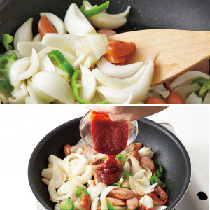 フライパンにバター20gを弱めの中火で溶かし、1のたまねぎとピーマン、ソーセージを加えて約3分間炒める(写真上)。トマトケチャップを加え(写真下)、全体を混ぜる。