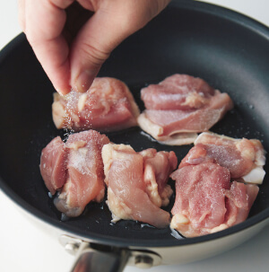 フライパンを火にかける前に油と鶏肉を入れ、冷たい状態から加熱するので、焦らずに調理ができる。