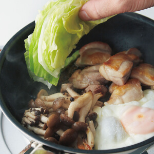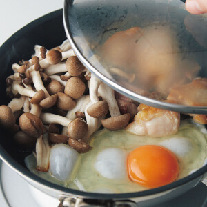 しめじは根元を除いてほぐす。卵は小さなボウルに割り入れる。1の鶏肉に焼き色がついたら上下を返して端に寄せ、しめじを加えてあいたところに卵を入れる。ふたをして弱めの中火で2~3分間蒸し焼きにする。